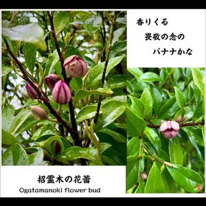 【万葉の中庭シリーズ:招霊木編】 ♧オガタマノキ:招霊木:banana shrub 小賀玉木の花蕾:Ogatamanoki flower bud 📝万葉の中庭で開花しようとしているオガタマノキの花蕾がたくさんみられます。 鼻を近づけるとバナナの香りがしますので、花言葉をかけて俺流の頓珍漢な一句を詠んでみました🐶 《一九献上》 「香りくる畏敬の念のバナナかな」 訳意;"The scent of Ogatamanoki is very gentle, similar to the scent of banana, and I tried to bring my nose closer with awe.." 【豆知識】 ♡オガタマノキの花言葉は、「畏敬の念」デス🐶 招霊木とも呼ばれて、縁起の良い木とされることに由来しています。 ♡オガタマノキ:招霊木・小賀玉木・黄心樹 学名;Michelia compressaは、モクレン科オガタマノキ属の常緑高木。 日本に自生するモクレン科では唯一の常緑樹である。 別名:オガタマ、バナナツリー、トキワコブシ、ダイシコウ 英名:banana shrub *名前は「招霊(おきたま/おぎたま)」が転化したもので、日本原産のオガタマノキは神木として神社の境内に植栽され、サカキの代わりに神前に供える地方もある。 ・モクレン科オガタマノキ属の落葉広葉樹で、関東地方以西の温暖な地に自生する。 ・トキワコブシ(常葉辛夷)という名が示すとおり、モクレン科の中では稀な常緑樹であり、皮質の葉は光沢があって美しい。 神事に使われるようになったのは、このあたりに要因があるのではないかと言われている。 ・成長は遅いが大きく育つため、一般家庭では鉢植えで管理するのが望ましい。 ・バナナツリーという別名のとおり、3月~4月にかけてバナナの香りがする花が咲く。 葉がよく茂り光沢があり、花はクリーム色で基部に紅の線が入って美しい。 ・一般家庭の庭木として普及しているのは、日本原産のオガタマノキではなく、カラタネオガタマ(=トウオガタマ)などの外来種。 他にも雲南オガタマ、パープルクイーンなどの品種が好まれている。 ・和名は神道思想の「招霊」(おぎたま)から転化したもの。 和歌、俳句の季語にも用いられる。 🗒日本神話においては天照大神の天岩戸隠れにおいて天岩戸の前で舞った天鈿女命が手にしていたとする説がある。 榊の自生しない地域を中心に神前に供える玉串として古くから代用されたり、神木とされて神社の神域などに植栽されている例がみられる。 ・常陸宮正仁親王のお印であり、宮崎県高千穂町や三重県伊勢市などが町のシンボルとしている。 ・蹴鞠やサッカーの神様として有名な京都市上京区の白峯神宮には樹齢800年のものがあり、京都市天然記念物に指定されている。 ✍️Works:Poetaster Kazyan//筍歌人 藪中和堂 Artistic:Ogatamanoki flower bud April 7,2023:past am 08:00';📱shooting Spril 7,2023:past am 11:40’;upload by Kazyan’s Green Studio