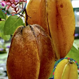 《実なりの秋*entry②》🍁 よーく熟れた実、渋柿みたい‼︎(๑>◡<๑) 黄色は以前、温室で見かけたことが❣️ ピンクの可愛いお花も咲いています💕 *スターフルーツ*⭐️ 和名・ゴシレン 実をカット✂️すると星型をしています。 🍎のような酸味がありサラダの彩りに👌 熟すと甘くなる、と🔍。