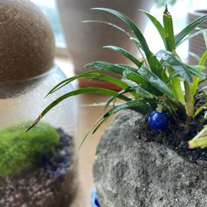 こんにちは♪ 龍の髭の実が青くなりました🔵🎶 秋に庭の龍の髭の整理をしていて、久々に、実を発見しましたが、その時はまだダークグリーンでした。 掘り上げて、小さな札幌軟石の鉢に植え込み、例の如く玄関風除室から出窓に移動。 やっと青くなったのでした。 いい事ありそう🤭🎶