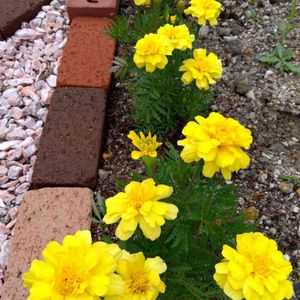 マリ-ゴ-ルド: 畑に種をまいて今たくさん咲いてます。 昨年5種類のマリ-ゴ-ルドの種を採って今年バラバラまいてみたのですが、 この2種類が強いようで一株一株がとても大きくたく最近たくさん花を咲かせています。 毎回見る度に花の数が増えています。