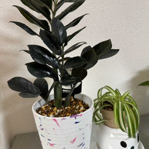 植え替えで、でっかい芋をぶち込みました ザミオクルカス・レイヴン シックな鉢を用意したかったんやけれど、少しポップな鉢に…高さとか考えるとちょうど良い鉢ってなかなかないですねー アクリル絵の具なんで、植え替え時にポロッと取れるのがまた経験🥴