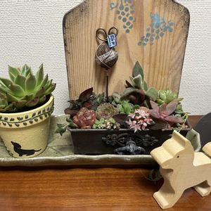 こんにちは〜😃☀️ 今日も暑くなりそうですね💦 まだ涼しいうちに撮影会📸✨ rikaraさんのタブローの寄せ植えもどうにか 根付いてくれて立て掛けられるように〜💖 もりもりになったセダムは✂️したよ😁 りょうさんからの多肉ちゃん達の ワイヤー籠寄せもいい感じに💓 赤ちゃんセンペルのちまちまもぎゅうぎゅうに❤️💚 黒法師を添えてシックにまとめたので 今日はotanicoさんから頂いた レトロなペコちゃんで💗 🏷ペコちゃん祭りに参加させてください❤️ 素敵な繋がりに感謝(*˘˘*).。.:*