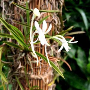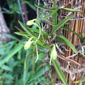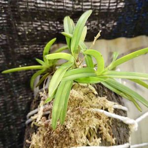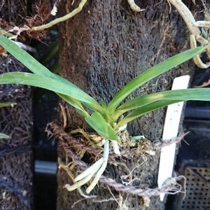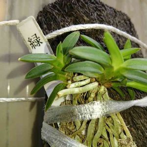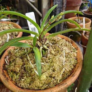 富貴蘭【垂崖】 中型の豆葉種で葉先がとがる。 天咲きで花弁の縁にピンクが細く入り距はあまり弧を描かずに下垂する。 〈現在ヘゴに取り付け中〉