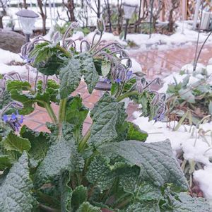 夜にシートをかけて保護していたボリジ🎵 回りに雪は残っているけれど元気🎵 ボリジの強さに驚きと喜び🎵