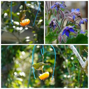 こんにちは♪ 「気絶したメジロちゃん事件」の後に ご近所のご主人様からワイヤーで作った 餌台をいただきました😃 ヒヨドリは近づけない作りになってるとか… 🍊を取り付けたら、メジロちゃんがチョコチョコやって来ます🐦♪ あの元気に飛び立って行った子も来てるのかナァ~(´∇`) お庭のボリジのブルーも鮮やかになってきました💙 楽しい週末をお過ごし下さ~いε- (´ー`*)♪
