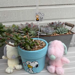 毎月2日はスヌーピーの日🏷️参加しまーす😁 ①名無しになってしまったエケさんの寄せ植えとスヌーピー 鉢は45さん ピックはMintさん ぬいぐるみはけいこさん 皆さんありがとうございます💕 ②サボ寄せ 窮屈になってきてるけど…植え替える?どうする?と悩んで、そのまままた棚に戻しました😆🤣