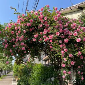 バラの師匠のお宅のリージャンロードクライマーが咲き始めてました☺️ 遠くから見ても木一面を濃いピンクにしていました 早速師匠に連絡して今日夕方見に行きました 香も濃くて💓 夕方になると、香りが降りてきて辺りに漂うそうです☺️ 本格的なバラシーズンはまだ1.2週後な感じです 何度も見にきちゃうんだろうなぁ😁