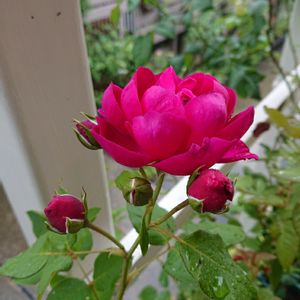 もう一つ赤バラさん(*´艸`*)🌹 アンダーザローズさん⸜( ´ ꒳ ` )⸝ 岩下篤也さんのバラさんです🌹 この子は系統が未分類の少し珍しいバラさんです⸜( ´ ꒳ ` )⸝ 枝は不安になるくらい細いのですが硬い"(⌯︎¤̴̶̷̀ω¤̴̶̷́)✧︎ ベイサル全然出ない꒰꒪д꒪|||꒱ガーン けど、蕾は結構つけてます(*´艸`*)🌹💕 小さめのつるバラさんとして育ててますが、イマイチよく分からないヾ( 〃ω〃)ノ 奥のパーゴラの下を飾ってくれてます⸜( ´ ꒳ ` )⸝ 丸い花弁がとてもキュートなバラさんです🌹