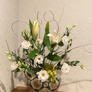 雨も上がり、また暑い日に、、 庭のカサブランカとヨウシュヤマゴボウの お花で玄関に、、 秋田杉の花器に投入れ🌱