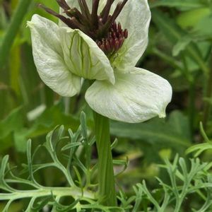 名前はよく分かりませんが ニゲラの葉っぱによく似ていますが? まだ咲きかけたところですが緑の葉っぱに囲まれてとても綺麗です💦