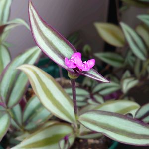 とても丈夫なトラディスカンティア・ゼブリナさん🌿 増えすぎたので一部をベランダに出したら野性的になってしまった😆💪 茎も太く葉っぱも大きくしっかりしています🌱 冬は大胆にカットしても夏になるとこの通り🤗 でもお日様に当たると葉っぱがキラキラして綺麗なんですよ🤭✨ 最近ピンク色のお花が咲きました😍🩷 2枚目pic お部屋のトラちゃんはヒョロヒョロで柔らかい葉っぱ🌿 お迎えしてからもう時期4年経ちますが、初めてお花が咲きそう❣️ 楽しみ〜😆💕