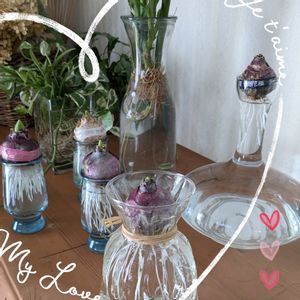 こんにちは ガラス瓶から見える ヒヤシンスとバンブーの根 真っ白の根っこ 細いベージュの根っこのおかげ(*˘︶˘*).。.:*♡グリーの葉っぱ、グリーンの芽を生き生きとさせてます♡♡♡♡♡♡♡♡♡ 見ていて癒されます