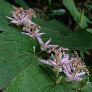 山路の杜鵑草(ヤマジノホトトギス) ユリ科ホトトギス属の多年草。山野の林内に生える。ホトトギスは湿った岩場に垂れ下がっていることがほとんどだが、本種は林縁や林内で見かけることが多く、茎も斜上することが多い。茎に下向きの毛が密生する。葉は長さ8~18㎝。葉に暗緑色の斑紋が見られることが多い。花期は8~10月。花は茎の先や葉腋に1個~3個つく。花被片には紅紫色の斑点がある。花被片が水平に開き反り返らない。花柱には模様がない。ホトトギス類で花の中央に立つ噴水状のものは、大きく立ち上がり3裂してさらに先が2裂する雌しべと、下向きの葯をつけた雄しべである。 花の地色が白くて広い地域に分布しているホトトギス類は『杜鵑草』『山杜鵑草』『山路の杜鵑草』である。しかし、『山路』は山道でよく見かけるからというような特徴を表す言葉ではなく、杜鵑草や山杜鵑草と区別するための記号といったようなもの。杜鵑草の杜鵑は鳥のホトトギスのことで、中国では野鳥のホトトギスのことを杜鵑(とけん)という。花びらに細かな紫点がある。この紫点を鳥のホトトギスの胸毛などの紫点に見立てて杜鵑草の名前がある。 日本に杜鵑草の仲間は10種ほどあるが、主なホトトギス類の違いは次の通り。 山路の杜鵑草 ・花被片は平開する ・花被片は白地に紫色の斑点がある ・花は茎の先や葉腋に1~3個つく ・葉は長楕円形または広披針形で長さ8~18㎝ 山杜鵑草 ・花被片は強く反り返る ・花被片は白色に紅紫色の斑点がある ・花は茎の先と葉腋から散房花序を出す ・葉は長楕円形または楕円形で長さ10~15㎝ 杜鵑草 ・花被片は斜開する ・花被片は白色で紫色の斑点がある ・花は葉腋に2~3個つく ・葉は長楕円状披針形で長さ10~20㎝ 台湾杜鵑草 台湾や西表島に自生する。観賞用として庭や公園などに植えられ、都会で見られるものはほとんど台湾杜鵑草と思ってよい。栽培されていたものが逃げ出し人家周辺に野生化している。山地に自生する杜鵑草との交配による園芸品種も多く作られている。 出典『山に咲く花』『里山の植物 ハンドブック』『野草 見分けのポイント図鑑』『野草の名前 秋冬』