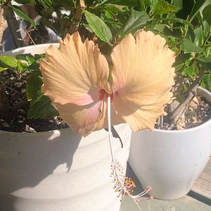 5年前に挿し木したペールオレンジのハイビスカス🌺今年初開花❤毎年ありがとう!何か♡みたいだね😄♫