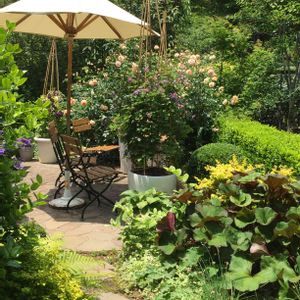 クレマチスの丘の花屋さんで買った蛇口付きの鉢に葉挿しを沢山入れました。花台は、ダイソーのものをペイントしました。 最近お庭が可愛くなってきて、外に居る時間も増えました🌼 タニパトも油断してたら、先週は貝殻虫とスス病 黒斑病が広がってて大変な目に遭いました。このエリアは大丈夫でしたー😓