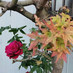 赤い薔薇 綺麗に剪定したモミジの隣に 一際綺麗に咲いています