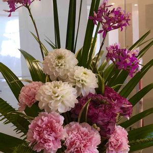 🌸病院受付のお花🌸 こちらも産婦人科の受付横に活けてありました。 上に伸びてる細いグリーンは何でしょうか? ダリア カーネーション ラナンキュラス エピデンドラム ドラセナ サンデリアーナ シュロ タマシダ