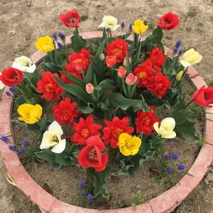 🌷今日のお花 チューリップ🌷 去年の4月のpicです。 友人の田舎の花壇、一緒に、❤⚪️️💛❤️⚪️💛と言いながら間違わないように植えました😅