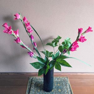 花器につぼを使ったことがあまりないのですが、色々な花器で生けられるようになるための、良い練習になりました! 紫と緑の色合いが素敵で、広がりのある作品になりました✨