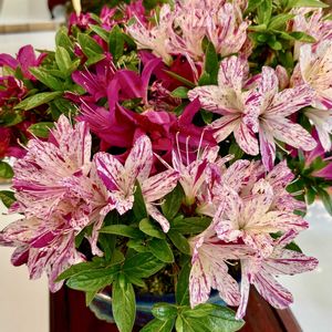 今日のお花*サツキ 出会い、いろいろ💖・:*+. 《スライドpic》 展示会より…(私好みをselect♡) ① 煌星 美しい絞り花弁😍ステキ‼︎ ②明美の月 ③鈴の誉 花友さんのお庭より ④ピンク🩷ピンク ⑤多種コラージュ