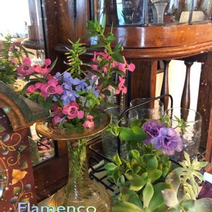 おはようございます😃✨ 今日は台風の影響でダメになった庭の草花シリーズです💦 リビングに飾りました😊 🌿アンゲロニア 倒れていた 🌿ルリマツリ 風で飛び出した 🌿ペチュニア 触ったら折れた サマーパープル 🌿多肉寄せ植え (これは成長し過ぎた)