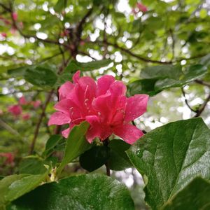 5月14日撮影 赤塚植物園 アブラツツジが咲いているところはケヤキ広場という植物園の一番奥の開けたところになっていて 周囲はツツジの山になっていて、さまざまなツツジで囲まれています。 でも時期が過ぎてしまったのか、花が咲いていたのはアブラツツジとこのジングウツツジくらいでした。 ジングウツツジ(神宮躑躅) ツツジ科ツツジ属 東海地方の蛇紋岩地帯に生息するツツジで、伊勢神宮の神域から発見されたことによる名前です。濃緑色の葉と紅色の花のコントラストが綺麗です。 別名 シブカワツツジ。 (日光植物園ホームページ より) ジングウツツジは狭義には三重県固有種。 樹皮は黒褐色、細かく剥がれ落ち、落ちたあとは赤褐色。上部で枝別れして、枝はやや水平に伸びる。葉は枝先に3個輪生する。葉身は長さ4~8(9)㎝、幅3~6(8.5)㎝の卵円形~卵状菱形、中央部で最も幅が広く、先は急に短く尖る。葉柄は長さ5~10㎜、毛が密生する。葉表は光沢があり、主脈に褐色の長い毛がある。葉裏は主脈に毛が密生する。枝先に花を2~4個つける。葉が展開後に開花する。花冠は濃紅色~紅紫色、直径3~4(5)㎝、深く5裂する。雄しべ10個。花糸は無毛。花柱は無毛又はまばらに毛がある。子房には白毛が密生する。萼は小さな皿形。花柄は長さ5~8㎜。萼や花柄に白毛が密生する。蒴果は長さ1~1.5㎝のゆがんだ円柱形、褐色の毛が密生する。 (三河の植物観察 より) 蛇紋岩地帯に局部的に自生します。葉は枝先に3輪生、花は漏斗状で色は濃緋色です。 (赤塚植物園の立て札 より) 伊勢神宮の神宮なのですね。 きれいな色のツツジでした🥰 花の下に、枝先の3個輪生した葉がわかりますね。 離れたところから撮影すると、この3個輪生はとてもわかりやすかったです。