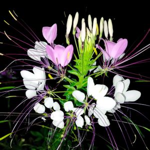 クレオメ 夕方🥵少しだけ涼しくなった頃、高価な水道水で、植木鉢の元気の無い花達に水やりをします😅 いつの間にか辺りは暗くなってました。 暗い所で光を当てて見るクレオメは美しい💞