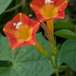 マルバルコウ オレンジ色の五角形で中心は黄色い、いかにも元気な月曜日にビタミンカラー🏷 花冠から突き出している雄しべと雌しべは、どちらも白いので違いが分かりにくいけれど、ちょっと長くて先が丸いのが雌しべ♀🟠 ヒメジョオンに絡みついているツルの巻き方向は、右肩上がりのZ巻↗🌀 絡みつかれると大変な被害になるので、黒大豆の畑の周りではさっさと刈られるけど、土手なんかには案外残ってます(¯∇¯٥) 山盛りの 8日は葉っぱの発表会🏷