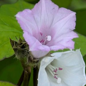 マメアサガオ と ベニバナマメアサガオ 白花と紅花のツーショット♡🩷 葯は赤紫色をしていて、ポンポンのようなのが雌しべやね◎ 萼の先は尖っていて、腺毛があり、名前の通りアサガオのミニチュア版だ♬ 赤錆の出た防獣柵に絡まり伸びる、つるの巻き方は右肩上がりのZ巻き↗ すでに結実を始めたものもあって、ボールを少し潰したような扁平な球形をしている🟢 短日性が強いのだろう、決まって秋になると咲いている(,,>᎑<,,)