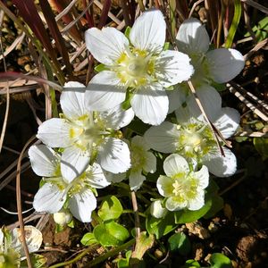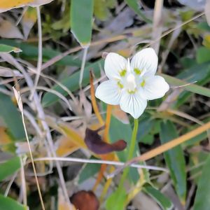 ウメバチソウ[梅鉢草] (バイカソウ[梅花草]) ニシキギ科ウメバチソウ属 北海道~九州に分布 11/22 那賀町でナカガワノギクを見に行った時に出会いました いつもは山頂の笹原の中で咲いてるのを見ていたけれど今年は行けなくて思いがけない場所に咲いていてとっても嬉しかったです 花径2~3cm、花のわりには葉がとても小さくてハート形で茎を抱く