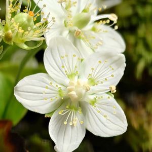 ウメバチソウ(梅鉢草) ニシキギ科 ウメバチソウ属 去年初めて出会ったお花に今年も会いに行ってきました❣️ 山の斜面の水の流れるところに咲いています 同じエリアにはスイラン、イワショウブ、シラタマホシクサが少し咲いています まだ咲き始めでしたが、囲いの中から外に出ているものが三輪あって、じっくり見ることができました 別名 バイカソウ(梅花草) 名前の由来は、花が家紋の梅鉢紋に似ている事 北海道〜九州の日当たりの良い山野に生える多年草 原産は北半球の温帯〜亜寒帯 草丈は15~30cm 花期は9~10月 花の直径は2~2.5cmで、白い可憐な花の中はとでも神秘的です 糸状に裂けた黄緑色の仮雄蕊の先に、黄色い腺体がとても美しい花です 去年投稿した際に詳しく調べて、とても複雑な構造のこの花に魅了されました💕 花の構造と仕組みについて書いたものは2024.11/14にありますので、宜しかったらどうぞ❣️ 私ももう一回見直しました❣️
