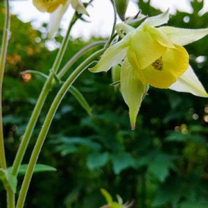 今日のお花 オダマキ 1⃣ 姫オダマキ 二色風鈴オダマキ 紫の帽子をかぶったみたいです💜👒 2️⃣ キバナオダマキ 黄長苧環 黄色い尾が長いわぁ〜 お出かけ先で咲いてました 🫒🌿🌿4