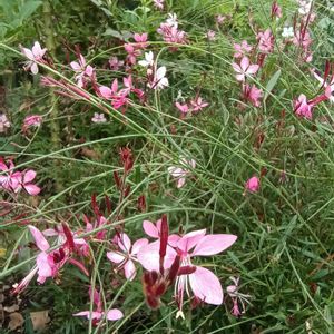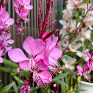 ガウラ リリポップピンク。 2年目です。 矮性のガウラですが去年は一枝だけ長く伸びたけど今年は半分くらいが伸びてしまっています。