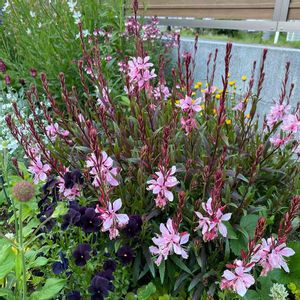ピンクのガウラも咲き始めました かわいーー まさか越冬すると思わず放置してたら3倍の大きさになりました…来年は白のガウラとともに株分けしないと