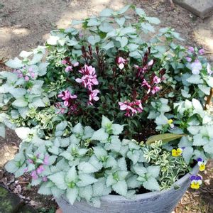 💞ガウラ•リリポップピンク💞 鉢が大きな物しか残ってなくて妥協して植えてしまった😞 気に入った鉢が見つかるまで、ここで我慢していただこう! 回りはギャザリングのラミウム達。