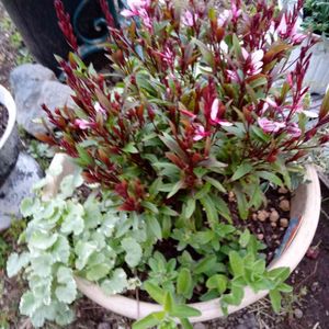 玄関先の鉢植えのガウラが咲き始めました😊 ヒューケラと寄せ植えにしてあります。 ヒューケラの勢いが凄すぎて埋もれそう😅