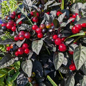 ⚫️ブラックパール これがトウガラシだって初めて知りました!観賞用トウガラシだそうです。黒い色は後から赤く色付きます。 ⚫︎ナス科 トウガラシ属 ⚫︎原産 熱帯アメリカ ⚫︎花期 7月〜9月(紫の花)