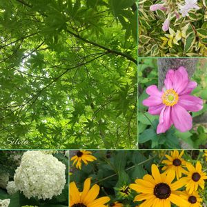 6/21 (火) ☁️🌧☁️ 🌲モミジ🌲 🌿🤍アベリア🤍🌿 学名❀✿Abelia × grandiflora 英名❀✿Abelia 和名❀✿花衝羽根空木(ハナツクバネウツギ) ※スイカズラ科 ※ツクバネウツギ属 原産地🔷中国 💗💚シュウメイギク💚💗 シュウメイギク(秋明菊) 学名❀✿Anemone hupehensis var. japonica 英名❀✿Japanese anemone、Japanese thimbleweed 和名❀✿秋明菊 ※キンポウゲ科 ※イチリンソウ属 原産地🔷中国 💚🤍アナベル🤍💚 💛🧡🌿ルドベキア🌿🧡💛 6/20付撮影📸📱💕駅前公園にて🤍💚💗💛🧡🌿🌲