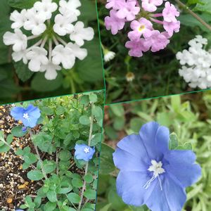 7/17 (日) ☁️☁️ 💗🤍🌿コバノランタナ🌿🤍💗 学名❀✿Lantana montevidensis ※クマツヅラ科 ※ランタナ属 原産地🔷南アフリカ ♣️「小葉のランタナ」のネーミング通り、ランタナを小ぶりにしたような花が地面一面に開花する匍匐性の低木。色はピンクや白、クリーム色、黄色などの単色をはじめ、最近は複色のものもある。繁殖力が旺盛で、たくさんの花が長く咲くので、広い敷地の花が咲くグランドカバーにも適している。♣️ 💙💚💙アメリカンブルー💙💚💙 エボルブルス 学名❀✿Evolvulus pilosus 英名❀✿Blue daze ※ヒルガオ科 ※エボルブルス属 原産地🔷南北アメリカ、アジア ♣️ヒルガオ科の半耐寒性多年草。 開花期は5~10月。這うように伸びながら、1~3cmのかわいらしい青い花をいくつも咲かせる。本来は「エボルブルス」という呼び名だが、1980年代の初輸入時には種が分からなかったため、アメリカから来たブルーの花という安直な命名で定着した。白い花の「アメリカン・ホワイト」も出回るようになった。♣️ 7/15付📸📱💕駅前公園花壇にて💗💚🤍💚💙💚