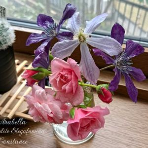 クレマチス アラベラ🩵 アフロディーテ エレガフミナ💜 バラ DAコンスタンス🩷 咲くお花、暑さでどれも小さめ😅