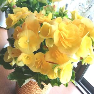 リーガースベゴニア スーパーでお安く売られていました😂部屋が明るくなるね🥹 ストローのナチャラル感とイエローがマッチ🥰 水漏れ防止に牛乳パックを切った入れ物を中にひいてます~ EMスプレーで活き活きしてます😆