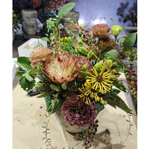 秋色のアレンジメント作りました💕 雨☂️続きでめっきり肌寒くなっているので、気分もすっかり秋気分🍁🌰🌾 プロテアさんやトルコキキョウの赤や茶色がかった紫色がとっても魅力的なのです…(ღ˘ㅂ˘ღ)💓