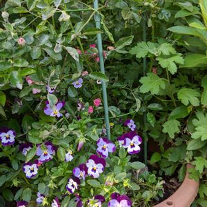 ビオラとミニ薔薇!もうちょっと、綺麗に仕上げたかったけど、ミニ薔薇が、ハダニに負けて、中々薬かけても、もどらない。花はなんとか咲いてきましたが、葉っぱが、元気ない。😢😭😆