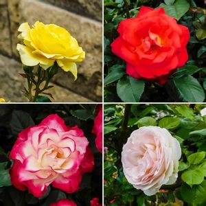 ヴェルニー公園のばら③ 左上から時計周りで 紅(くれない)…エックスのHideを連想させる! 湘南ファンタジー、 ホワイトクリスマス、 プリンセスアイコ、 ホワイトウィングス