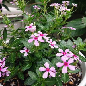 小輪のニチニチソウが可愛くてお気に入り🌸7/11にpostした2色植えなのですが、特にピンクウィズアイの勢いがすごいです✨2色と分からない位馴染んでます😁 昨日はハダニさんをいくつかの鉢に発見していまいました😢カット✂️したり、水スプレーして対策❗️ 育て方で、乾燥気味にというのが多い中、乾燥を好むハダニ対策には水…難しい🤔