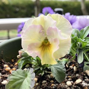 ブルーのビオラ(鉢が😁) 古い色あせたプラ鉢をリメイクし活用してます! 花より鉢が目立ってます❗