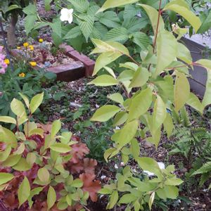 手前の黄緑色の葉っぱの木。 なんの木かわかる方いますかー? 勝手に生えてきて… うちにある木ではなさそうな😅