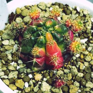 先日、サボテン団地で見つけてお迎えした、色の綺麗な子。😃✨ ギムノカリキウム アニシトシー・ダムシーと名札に書いてありました。 検索したら、麗蛇丸と出てきました。😆 錦ではない麗蛇丸は、いくつか持っているけど、これはカタカナで書かれていたので、違うものかと思っていました。😅 ベビーちゃんがたくさんついているので、大きくなるのが楽しみです。🎶😊✌️ 頑張ろう❗日本‼️ 👊✨