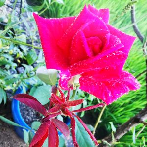 レッド・インテューション 春は遅めに咲き始め そこからは ずっと 咲き続ける薔薇🌹🌿です この暑い✨☀️✨のに シュートをだして 蕾も沢山つけて 次々咲いてます➰ 猛暑で 枯れ枯れの庭で こんなに君は 綺麗✨✨なんだね