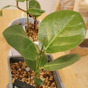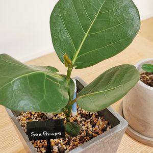 革のような質感、丸い大きな濃い葉の色に惹かれ、ネットにて購入。存在感あります! カシワバゴムと迷いましたが、くねくねとした奔放な伸び方を見てみたくて、シーグレープをお迎えしました。